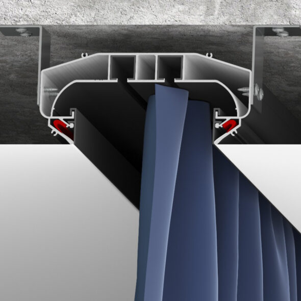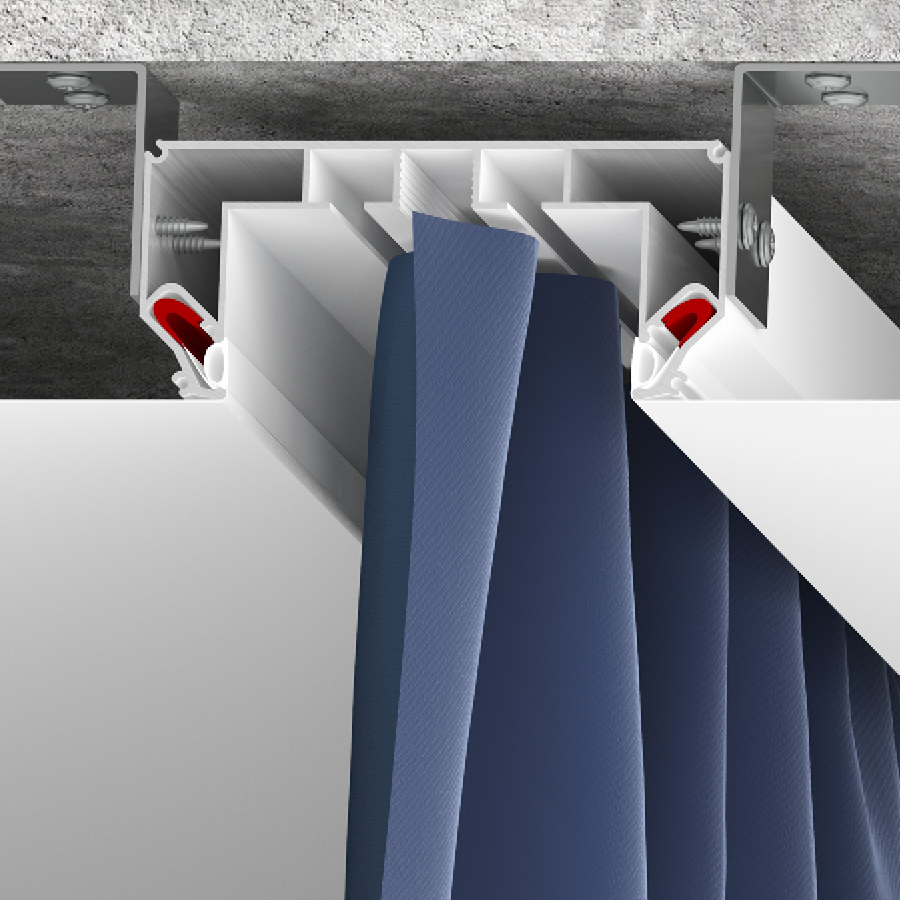 Главное преимущество скрытого потолочного карниза – это безупречный внешний вид. Все механизмы надежно спрятаны за полотном натяжного потолка, остается видна только аккуратная ниша, из которой красиво ниспадают шторы. Такое решение визуально увеличивает высоту стен и делает пространство более воздушным. Конструкция надежна и рассчитана на длительную эксплуатацию даже с тяжелыми портьерами. Для монтажа мы используем только проверенные системы, такие как SK Magnum, SK Novus и LumFer.